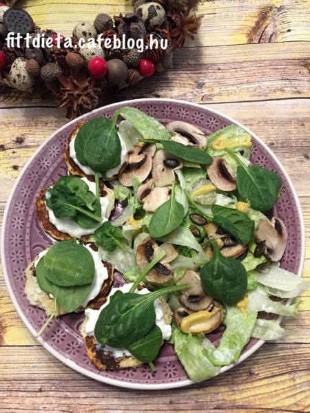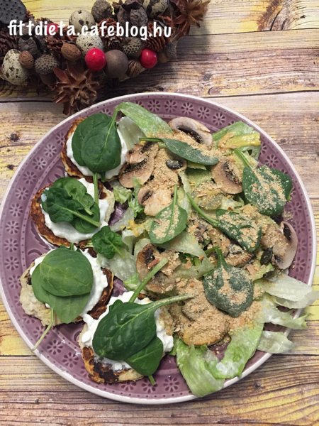 A cottage cheese-t a natúr joghurttal és a fokhagymaporral és a himalájai sóval kikeverjük. A tócsnik tetejére halmozzuk, majd szórunk rá egy kevés bébispenótot.