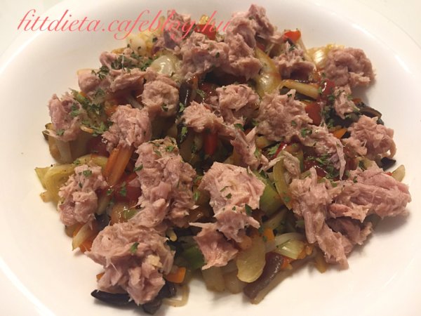 A zöldségkeverék a zacskón található leírás szerint megfőzöm, hideg vízzel leöblítem. Összekeverem a fűszerekkel, és a szójaszósszal. A tetejére rakom a tonhalat, az apróra vágott tojásfehérje rudat, és ketchupot nyomok rá.