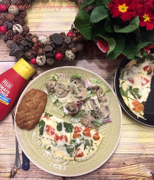 A tojást a tojásfehérjével felverjük, majd sózzuk, fűszerezzük. Ezután hozzákeverjük a felkockázott sonkát , fekete erdei sonkát, joghurtot, a félbe vágott koktél paradicsomot,a spenótot. Az egészet egy kisebb méretű serpenyőbe öntjük, és előmelegített, 180 fokos sütőben 20-25 perc alatt készre sütjük. Az utolsó 5 perc előtt kivesszük , megszórjuk a reszelt sajttal, és visszatesszük a sütőbe, hogy szépen rápiruljon. Az utolsó 5 percben én grill fokozatra kapcsoltam a sütőt. Cukormentes ketchupot tettem rá tálalás előtt. A salátát tálba tettem, ráöntöttem az öntetet, tettem hozzá majonézt, és megszórtam a sörélesztő pehellyel. Egy cukkini bagettet félbe vágtam, és száraz serpenyőben mindkét felét lepirítottam. A cukkini zsemle receptjét ITT találjátok.