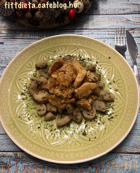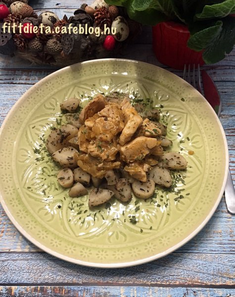 A petrezselymet megpucoljuk, kockára vágjuk, és sós vízben, fedő alatt puhára főzzük. Amíg fő, addig elkészítjük a húst.A vöröshagymát apróra vágjuk, a csirkemellet kockákra vágjuk. A vöröshagymát wokban üvegesre pirítjuk, majd rádobjuk a csirkemellet és fehéredésig pirítjuk. Használhatunk sima, magas falú serpenyőt, de ebben az esetben egy kevés kókuszolajat, vagy olíva olajat tegyünk alá. Közben fűszerezzük ízlés szerint sóval, borssal, majoránnával és pirospaprikával. Öntsük fel egy kevés vízzel ( 1 dl), és fedő alatt addig főzzük, amíg a hús teljesen megpuhul. Ha a petrezselyem gyökér megfőtt, leszűrjük, és wokban megpirítjuk, miközben fűszerezzük ízlés szerint himalája sóval, borssal, rozmaringgal, kakukkfűvel, oregánóval, bazsalikommal, szerecsendióval.
