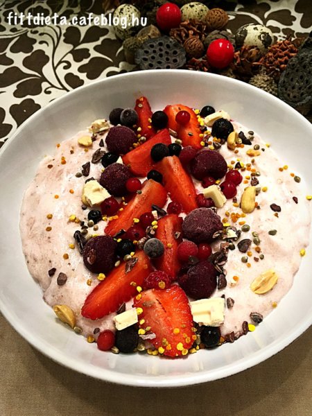 A zabkása tetejét félbe vágott eperrel és erdei gyümölccsel díszítjük, és megszórjuk a fent leírt hozzávalókkal.