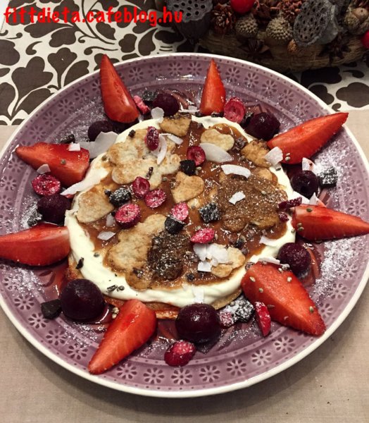 A töltelékhez kikeverjük a túrót a natúr joghurtot és ízlés szerint ízesítjük eritrittel vagy vaníliás eritrittel. A töltelék tetejére rátettem a palacsintából kiszúrt formáimat. Díszítettem eperrel, meggyel, apróra tört étcsokoládéval. Végül megszórtam virágporral, kendermaggal, tőzegáfonyával, kókuszchipssel, és leöntöttem eper öntettel.