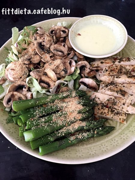 A csirkemellet megmossuk, szeletekre vágjuk, majd fűszerezzük sóval, fűszerkeverékkel, fokhagymával. Serpenyőben olíva olajjal kikent serpenyőben puhára sütjük. Ha kihűlt vékony csíkokra vágjuk. A spárgát eltörjük, ahol magától eltörik, majd sós vízben puhára főzzük közepes lángon. A salátához a saláta keverékhez ízlés szerint adunk saláta öntetet, majd megszórjuk sörélesztő pehellyel. A csiperke gombát vékony szeletekre vágjuk ( ha egész gombánk van) és száraz serpenyőben átpirítjuk és a saláta tetejére tesszük. Az öntethez a natúr joghurtot kikeverjük a mustárral, ízlés szerint tehetünk bele sót, vagy fokhagyma granulátumot is.