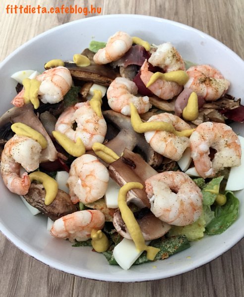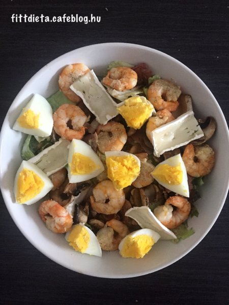 Egy serpenyőben a kevés olívaolajon a befűszerezett garnéla rákokat megsütjük. A tojást sós vízben feltesszük főni, majd forrás után alacsony lángon 3 percig főzzük, hogy kemény tojást kapjunk. A saláta keveréket összekeverjük a natúr joghurttal ( vagy totu krémmel) és az újhagymával. Száraz serpenyőben átpirítjuk a gombát, és az apróra vágott fekete erdei sonkát. A salátát egy tálba tesszük, tetejére rakjuk a gombát és a fekete erdei sonkát, a szeletekre vágott főtt tojást, a camembert sajtot, és a rákokat. Az egészet meglocsoljuk pár csepp citromlével.