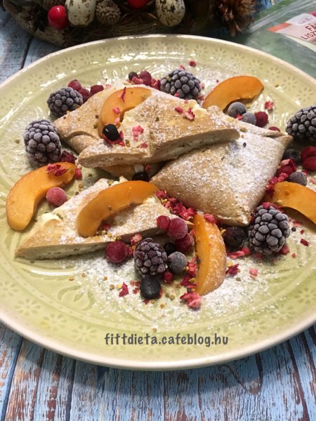 A tésztát bambuszrostliszttel megszórt felületen átgyúrjuk, majd kb. fél cm vastag téglalapra kinyújtjuk. Három darab egyforma téglalapra vágjuk. Mindegyik közepébe teszünk a túró töltelékből és a tészta sarkait középre hajtogatjuk, majd összenyomjuk, hogy ne folyjon ki a töltelék. Egy szilikonos ecset segítségével lekenjük tojással, és előmelegített sütőben 180 fokon 25 percig sütjük. Hagyjuk kihűlni, majd megszórjuk porrá őrölt eritrittel. Gyümölcsökkel, virágporral és szárított tőzegáfonyával tálaljuk.