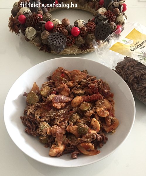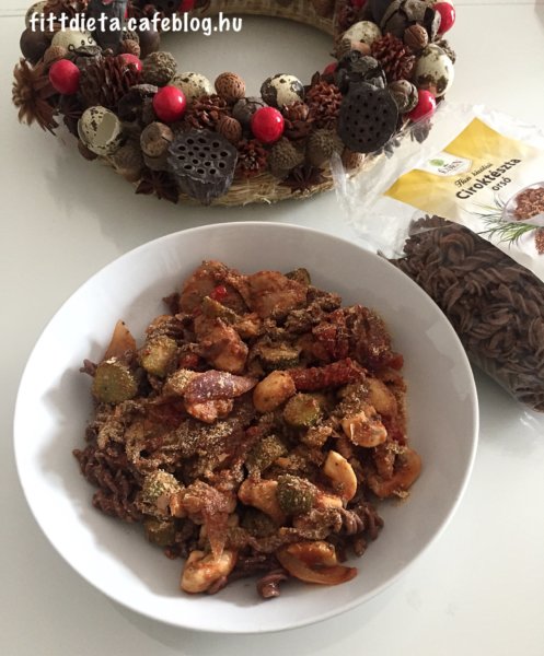 Egy lábasba feltettem vizet főni, amit sóztam, majd 25 g Éden Prémium cirok tésztát bele tettem a forrásban lévő vízbe, és 6-7 perc alatt. Ha a tészta elkészült, leszűrtem és hideg vízzel átöblítettem. Egy serpenyőben 50 g félbe vágott csiperke gombát megpirítottam, majd hozzákevertem a csirkecombos raguból egy adagot, majd felöntöttem 100 g cukormentes paradicsompürével. Hozzákevertem a tésztát és tálba szedtem. 50 g csemege uborkát karikákra vágtam, és a tetejére raktam. Végül az egészet megszórtam sörélesztő pehellyel.