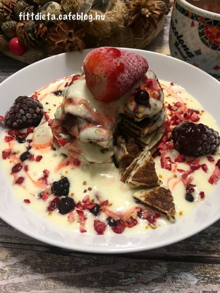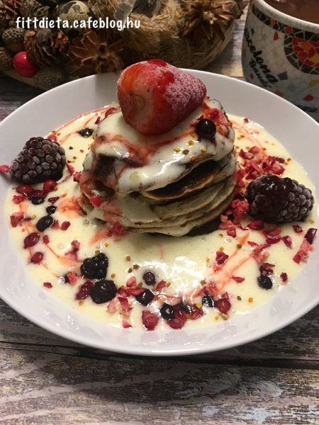 Minden hozzávalót csomómentesre összekeverünk. Pihentetjük 10 percig a tésztát. Kókuszolajjal kikent palacsinta sütőben mini palacsintákat sütünk közepes hőfokon. Mindkét oldalát megsütjük. Egymásra pakoljuk. Egy lábasban a pudingport a növényi tejjel és vízzel addig főzzük, amíg be nem sűrűsödik. A tojásfehérjét felverjük, majd mikor már szinte teljesen kemény a hab, az eritritet hozzá adjuk, és teljesen kemény habbá verjük. Amikor a puding langyosra hűlt, belekeverjük a habot, és leöntjük vele a palacsinta tornyot. A gyümölcsökkel, virágporral, szárított tőzegáfonyával díszítjük. ( Természetesen bármi kerülhet a tetejére, csak a fantázia és a diéta szab határt)