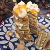 Minden hozzávalót csomómentesre összekeverünk. Pihentetjük 10 percig a tésztát. Kókuszolajjal kikent palacsinta sütőben mini palacsintákat sütünk közepes hőfokon. Mindkét oldalát megsütjük. Egymásra pakoljuk. Egy lábasban a pudingport a növényi tejjel és vízzel addig főzzük, amíg be nem sűrűsödik. A tojásfehérjét felverjük, majd mikor már szinte teljesen kemény a hab, az eritritet hozzá adjuk, és teljesen kemény habbá verjük. Amikor a puding langyosra hűlt, belekeverjük a habot, és leöntjük vele a palacsinta tornyot. A gyümölcsökkel, virágporral, szárított tőzegáfonyával díszítjük. ( Természetesen bármi kerülhet a tetejére, csak a fantázia és a diéta szab határt)