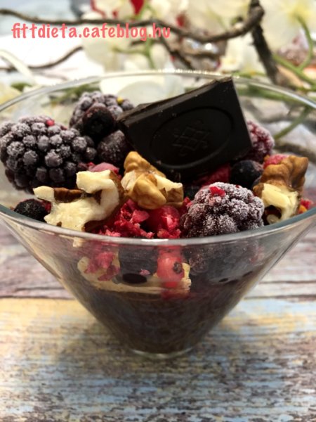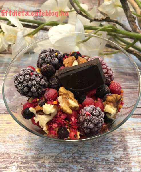 A feldarabolt piskótát négy pohár aljába helyezzük. Majd ráöntjük a sütőtökös krémet. A tetejére halmozzuk a vegyes gyümölcsöket. Megszórjuk a szárított tőzegáfonyával, virágporral, dióval. Majd a tetejére helyezünk egy kocka étcsokoládét.