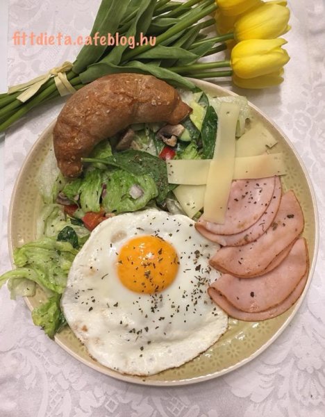 A képen kifli formájában látható. Mellé saláta, tükörtojás, csirkemell sonka és heringfilé krém.
