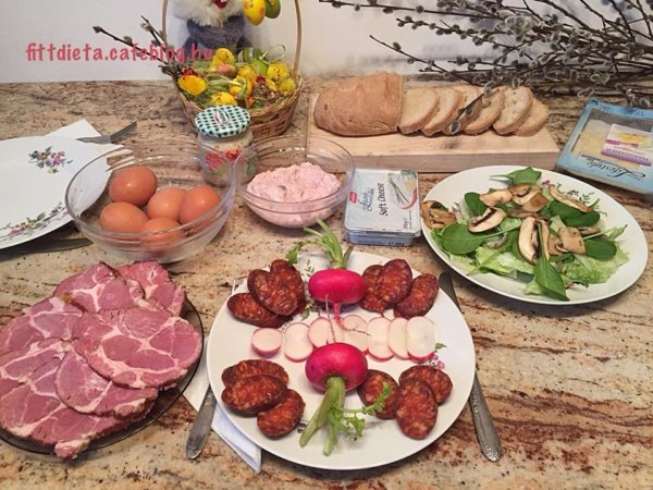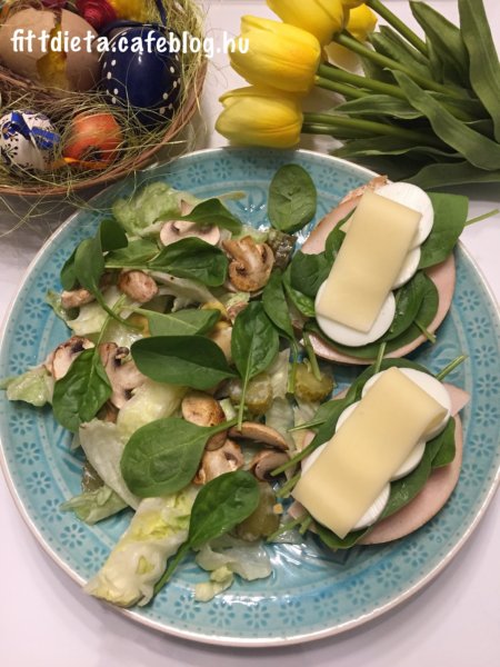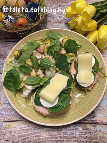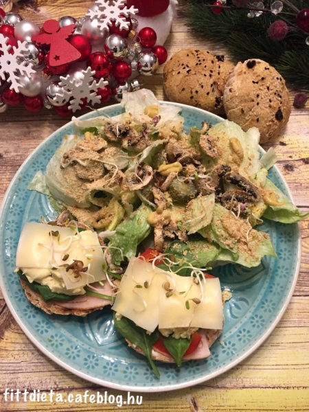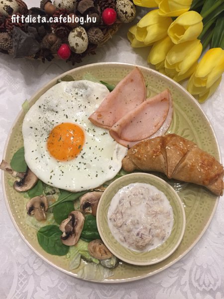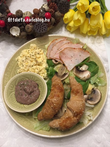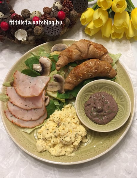 Házi csirkemájkrémmel. Tojásrántottával, csirkemell sonkával, salátával.