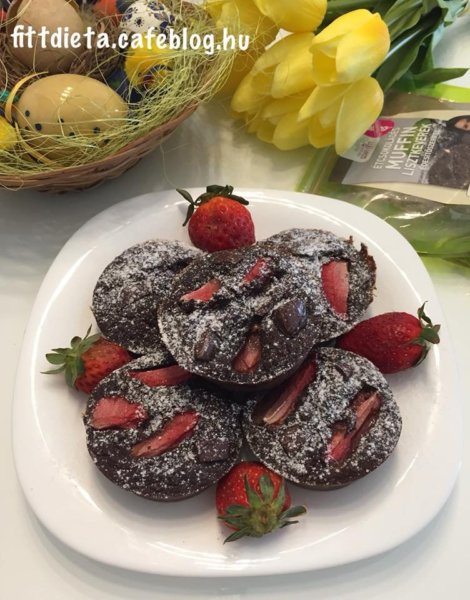 A folyékony hozzávalókat keverjük össze ( tojás, tojásfehérjelé. növényi tej, víz ). Ehhez adjuk hozzá a megpucolt, lereszelt cukkinit. Keverjük hozzá a lisztkeveréket és a kakaóport. Pihentessük a masszát 10 percig, majd adagoljuk 5 darab szilikonos muffin formába. Az epret aprítsuk fel, és az étcsokoládét is törjük apróra. Egyenletesen mindegyik muffinba nyomkodjuk bele az epret és a csokoládét. Előmelegített sütőben 180 fokon 25 percig süssük.