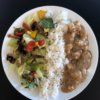A zöldborsót enyhén sós vízben főzzük készre. Ha elkészült, szűrjük le, és tegyük félre. A vöröshagymát felaprítjuk, és kevés olívaolajon vagy kókuszolajon üvegesre pirítjuk. Rádobjuk a kockákra vágott csirkemellet, és fehéredésig pirítjuk. Hozzáadjuk a rizstejszínt, és ha szükséges egy kevés vizet. Fűszerezzük a sóval, fokhagymaporral, és a zöld fűszerekkel. Hozzáadjuk a zöldborsót és a laskagombát. Közepes lángon, addig főzzük, amíg a csirkemell teljesen megpuhul. Én quionával és salátával tálaltam.