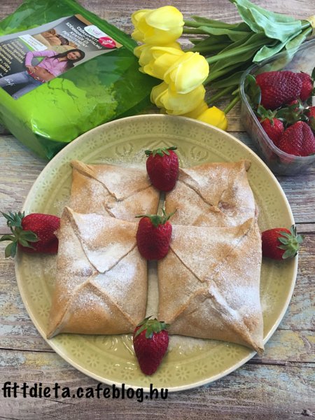 Pihentessük 10 percig. Addig készítsük el a tölteléket. A túrót a natúr joghurttal keverjük ki, és adjuk hozzá az eritritet és a vaníliás eritirtet ízlés szerint. Nyújtsuk ki téglalap alakúra a tésztát, és vágjuk 4 egyforma részre. Mindegyik közepére halmozzunk a túrós töltelékből, és tegyük a a tetejére az apróra vágott eper szemeket. A tészta négy szélét középen fogjuk össze. Nyomkodjuk le a hajtásokat, hogy ne folyjon ki a töltelék. Kenjük le tojással egy szilikonos ecset segítségével. Előmelegített sütőben 180 fokon süssük 35-40 percig. Ha kihűlt, tálalás előtt szórjuk meg porrá őrölt eritrittel.