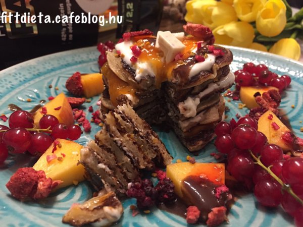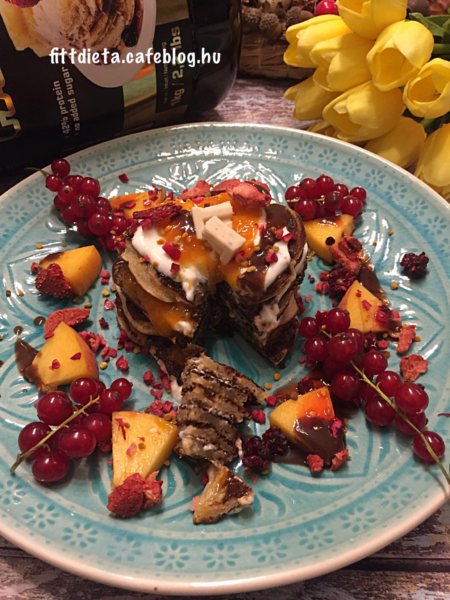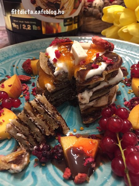 A túrót a natúr joghurttal és ízlés szerint eritrittel krémesre kikevertem. Egy palacsintát megkentem a túrós krémmel, erre tettem a következő palacsintát, amit baracklekvárral kentem meg, majd a következőt ismét a túrós krémmel, majd a következőt ismét lekvárral és így tovább. A tetejét egy kocka cukormentes csokoládéval díszítettem. Köré pedig barackot, ribizlit, szárított gyümölcsöket, virágport, Waldenfarm eper és csokoládé öntetet tettem.