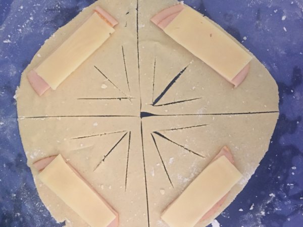 Keverjük el a folyékony hozzávalókat. Adjuk hozzá a lisztet, és keverjük el csomómentesre. Tegyük a tésztát 20 percre a hűtőben pihentetni. Lisztezett felületen ezután gyúrjuk át, majd osszuk két egyenlő részre. Az egyik tésztát nyújtsuk ki kör alakúra. Vágjuk 4 egyforma részre. A hosszabbik részére helyezzünk egy keskenyebb szeletre vágott csirkemell sonkát és egy csík sajtot. A hosszabbik oldalánál kezdve tekerjük fel, és formáljuk kifli formára, kicsit nyomkodjuk le a széleit. A másik adag tésztával ugyanígy járunk el, így lesz összesen 8 darab kiflink. Sütőpapírral bélelt tepsire helyezzük a kifliket, és lekenjük tojással, majd megszórjuk szezámmaggal. Előmelegített sütőben 180 fokon 25 percig sütjük.