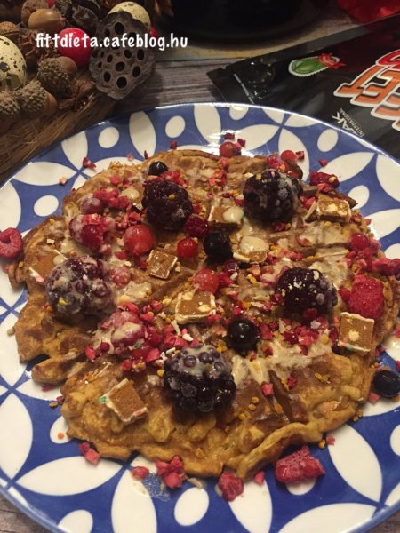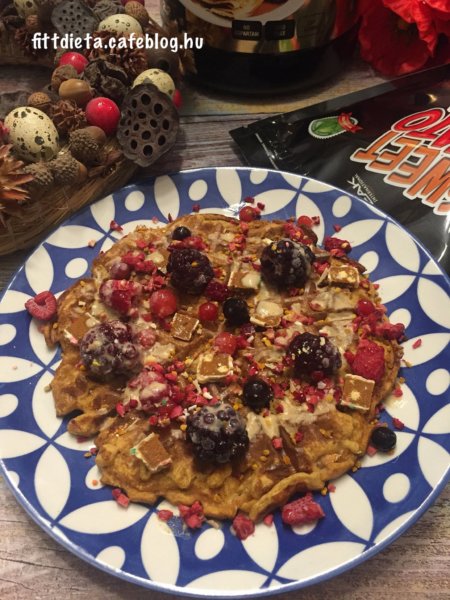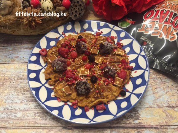 Az édesburgonyát vágjuk félbe, és előmelegített sütőben 200 fokon 30 percig süssük. Ezután kanalazzuk ki a belsejét, és villával törjük össze, hogy ne legyenek benne darabok. Ezután a burgonya pürével keverjük simára az összes többi hozzávalót. Pihentessük 5 percig a masszát. A gofri sütőt egy szilikonos ecset segítségével kenjük ki, majd süssük benne készre a gofrikat. A megsült gofrik tetejét a fenn leírtakkal díszítsük. Ez ízlés és diéta szerint bármi lehet.