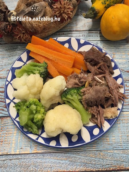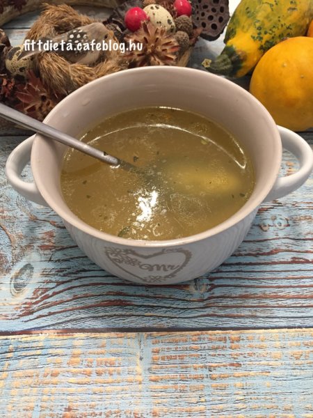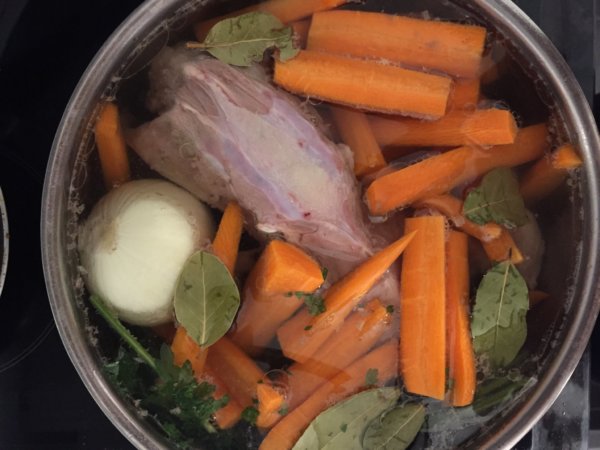 A libaaprólékot megmossuk, vízbe tesszük és fel tesszük főni. Amíg fő megpucoljuk a zöldségeket, és csíkokra vágjuk. Ha felforrt a víz, kiszedjük a húst és a májat, és leöntjük a vizet, elmossuk az edényt. Újra teletöltjük vízzel ( 4 liter), és visszarakjuk a húsokat, beletesszük a zöldségeket, fűszerezzük, és letakarjuk fedővel. Alacsony lángon, ügyelve rá, hogy ne forrjon fel, épp csak gyöngyözzön 3-4 órát főzzük.