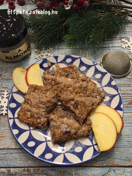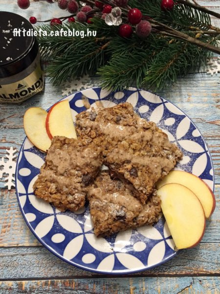 Az almákat pucoljuk meg és nagy lyukú reszelőn reszeljük le. Ehhez adjuk hozzá a tojást, a folyékony kókuszolajat, az eritritet, a vaníliás eritritet, a sütőport, a fűszereket és végül a zabpelyhet. Keverjük csomómentesre és pihentessük a masszát 10 percig. Ezalatt az étcsokoládét vágjuk apró darabokra ( vagy használjunk csokoládé cseppeket) és keverjük hozzá a masszához. Egy tepsit béleljünk ki sütőpapírral és öntsük bele a tésztát. Úgy oszlassuk el, hogy körülbelül 1,5- 2 centiméter magas legyen a tésztánk. Viszonylag sűrű tésztát kapunk, így ha nagyobb a tepsi akkor se fog szétfolyni a tészta. Előmelegített sütőben 175-180 fokon 30-35 percig süssük. Ha kihűlt vágjuk hat szeletre, szórjuk meg porrá őrölt eritrittel és csorgassunk rá egy kis mandulavajat.