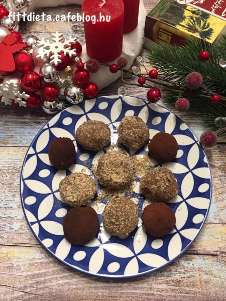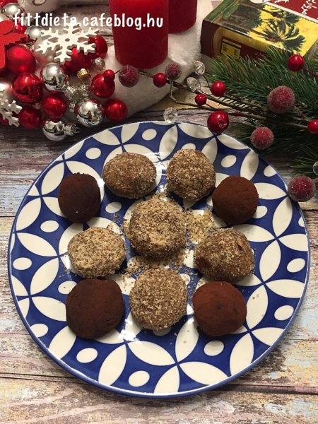 Minden hozzávalót aprítógépbe tesszük, és addig aprítjuk, amíg teljesen krémes nem lesz. Nekem az aprítóban nem lett teljesen krémes, így átraktam egy magas falu edényben, és botmixerrel pürésítettem teljesen krémesre. Ezután 30 percre hűtőbe tettem. Kivéve a hűtőből egyforma golyókat formáztam belőle, és meghempergettem a kakaóporban. Ezután érdemes hűtőbe tenni pár órára, akár egy éjszakára is, hogy teljesen összeérjenek az ízek.
