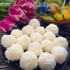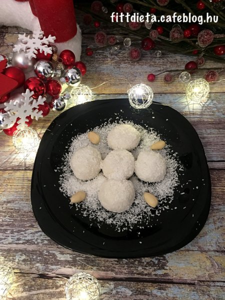 A kókusztejport elkeverjük a kókuszreszelékkel majd félretesszük. A vizet az eritrittel feltesszük forrni, majd a kókuszreszelékes keverékhez öntjük. Hozzáadjuk a kókuszolajat is, és alaposan kikeverjük. Legalább 1 órára hűtőszekrénybe tesszük, hogy kihűljön és formázható legyen a massza. A lehűlt masszából nedves kézzel kis golyókat formázunk, úgy, hogy mindegyik közepébe egy mandulaszemet rejtünk. Megforgatjuk kókuszreszelékben, majd fogyasztásig hűtőszekrényben tároljuk.Fogyasztás előtt 20 perccel vegyük ki a hűtőből, hogy kicsit megpuhuljon.