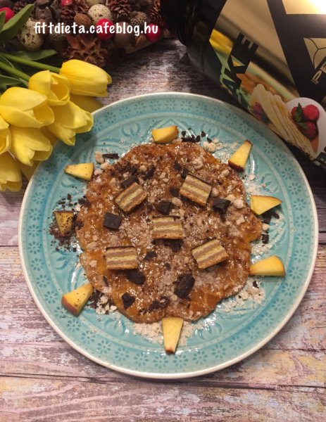A diót az eritrittel daráljuk össze egy kávédarálóban. Ezután minden hozzávalót keverjünk össze, és adjuk hozzá az darált diós eritritet. Keverjük csomómentesre. A gofri sütőt egy szilikonos ecset segítségével kenjük ki kókuszolajjal és öntsük bele a masszát. Süssük készre. A tetejére először a diót és az eritritet daráljuk össze egy kávédarálóban. A megsült gofrit tegyük ki egy tányérra, kenjük meg a cukormentes lekvárral, szórjuk meg a darált dióval. Díszítsük a barackkal, a csokoládéval, és ízlés szerint kockára vágott zserbóval.