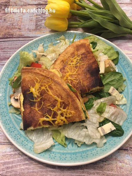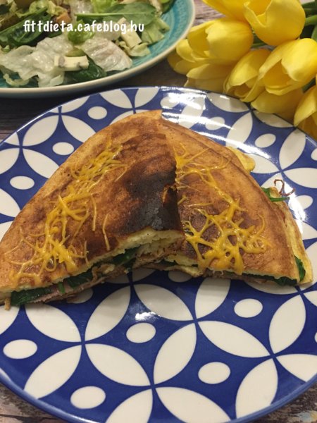 A tojást, a tojásfehérjét felverjük és sózzuk. ( én adtam hozzá egy pici vizet is) Kókuszolajjal kikent serpenyőben közepes lángon megsütjük. Az egyik felére pakoljuk a tölteléket, majd a másik felét ráhajtjuk. Megszórtam a tetejét a maradék sajttal. Egy nagy adag salival ettem reggelire.