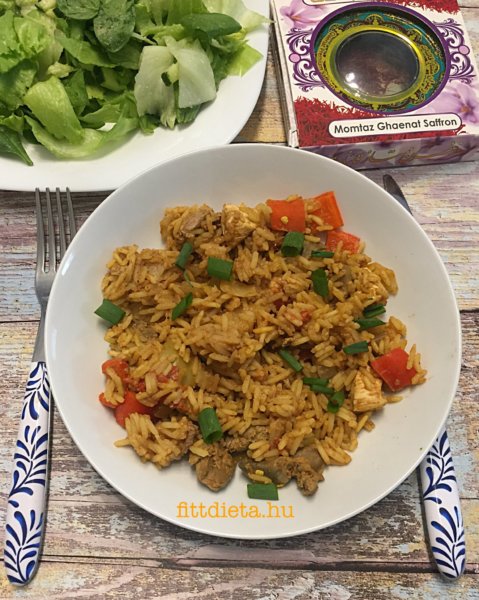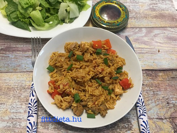 A vöröshagymát apróra vágjuk és egy wok serpenyőben kevés olívaolajon üvegesre pirítjuk. Erre dobjuk az apróra vágott kaliforniai paprikát és a paradicsomot. A rizsszemeket alaposan átmossuk, majd a zöldséges alaphoz adjuk. Felöntjük a húsleves alaplével és beleszórjuk a fűszereket. Alacsony lángon kb. 15 percig főzzük az egészet. Letakarjuk és néha megkeverjük. Végül hozzáadjuk a felkockázott csirkemellet és a csirkemájat. Alacsony lángon kb. még 15 percig főzzük.