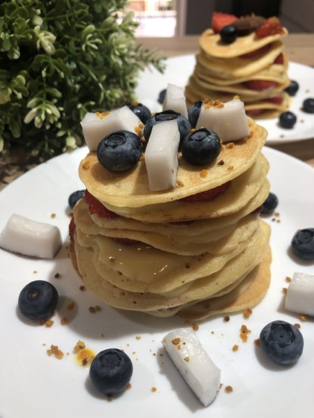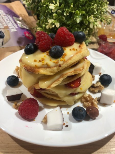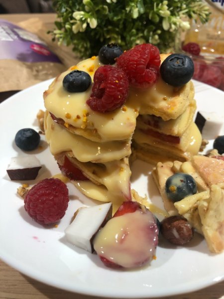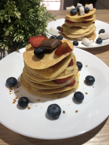Most pedig szintén Spanyolországban, pár utcával arrébb, a szülinapomra készítettem el magamnak. Aztán rájöttem miért itt kerül elő leginkább. Mert semmi extra dolgot nem igényel. A lisztet hoztam magammal, azon kívül mindent lehet hozzá itt is kapni. Nem kell aggódnom, hogy nem ismerem a főzőlapot, a serpenyőt stb. és leragad vagy elszakad. Nem kell hozzá felverni a tojásfehérjét, nem kell hozzá sütőpor és még sorolhatnám, hány ezer buktatója van, ha idegen országban akarsz nekiállni a paleo palacsintának 😀