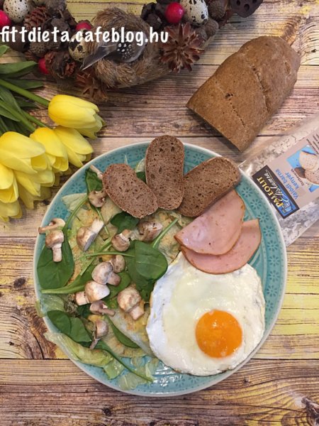 A kenyérből 3 vékony szeletet vágtam, és tükörtojással, csirkemell sonkával, salátával tálaltam.
